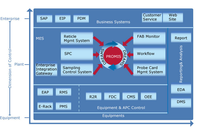公司CIM系統(tǒng)以MES系統(tǒng)為中心,配以設(shè)備的自動(dòng)運(yùn)行系統(tǒng)(EAP),菜單管理系統(tǒng)(RMS),設(shè)備預(yù)防性維護(hù)系統(tǒng)(PMS),與先進(jìn)的制程控制(APC)等相互配合,以維持良率與產(chǎn)能,再輔以質(zhì)量監(jiān)控系統(tǒng)、實(shí)時(shí)報(bào)告系統(tǒng)、以及靈活的系統(tǒng)整合接口,構(gòu)成了一個(gè)完整的計(jì)算機(jī)集成制造系統(tǒng)。這一系統(tǒng)進(jìn)一步實(shí)現(xiàn)了生產(chǎn)過程的自動(dòng)化,使工藝更加穩(wěn)定,質(zhì)量及工藝可靠性獲得提高,產(chǎn)品的生產(chǎn)周期進(jìn)一步縮短。